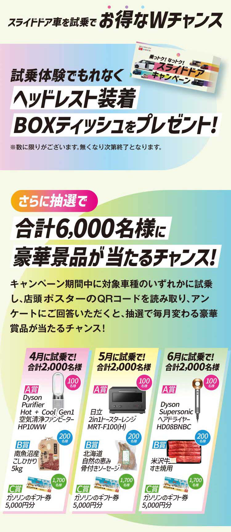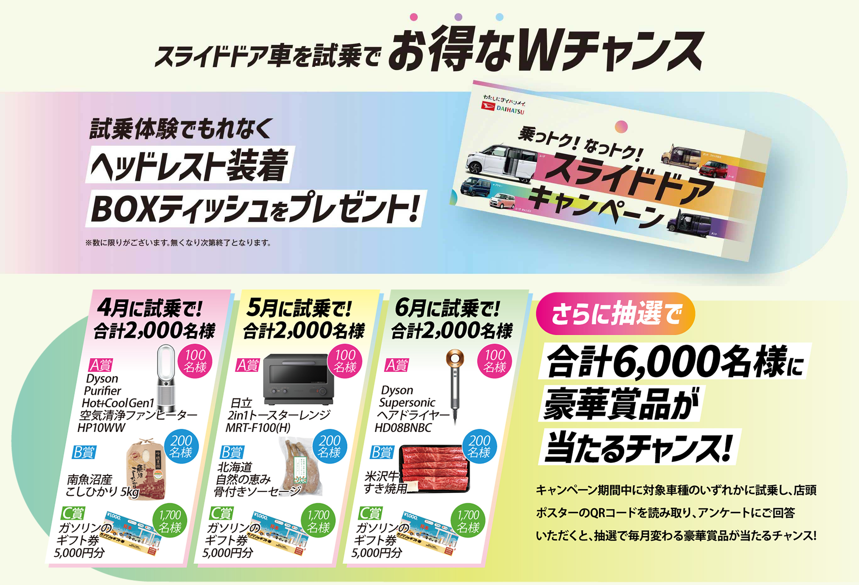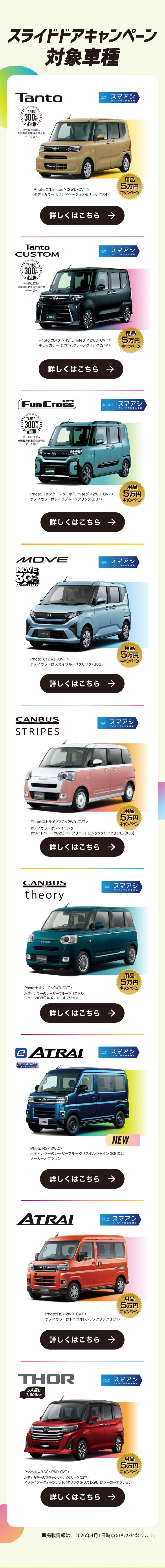 ■キャンペーン期間中に店頭でタント・タントファンクロス・ムーヴ・ムーヴキャンバス・e-アトレー・アトレー・トールの新車を試乗いただいた方が対象のキャンペーンとなります。 ■キャンペーンは予定よりも早く終 了することがございます。 ■用品画像は一例です。賞品の仕様は予告なく変更となる場合がございます。 ■キャンペーンの内容は予告なく変更となる場合がございます。■当選の権利を他人へ譲渡、または換金することはできません。 ■掲載情報は、2026年4月1日時点のものとなります。詳しくは、店舗スタッフにお問い合わせください。