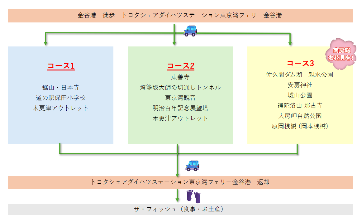 | 比較項目 | 観光バス(川崎・横浜発) | フェリー+カーシェア (久里浜港→金谷港→木更津) |