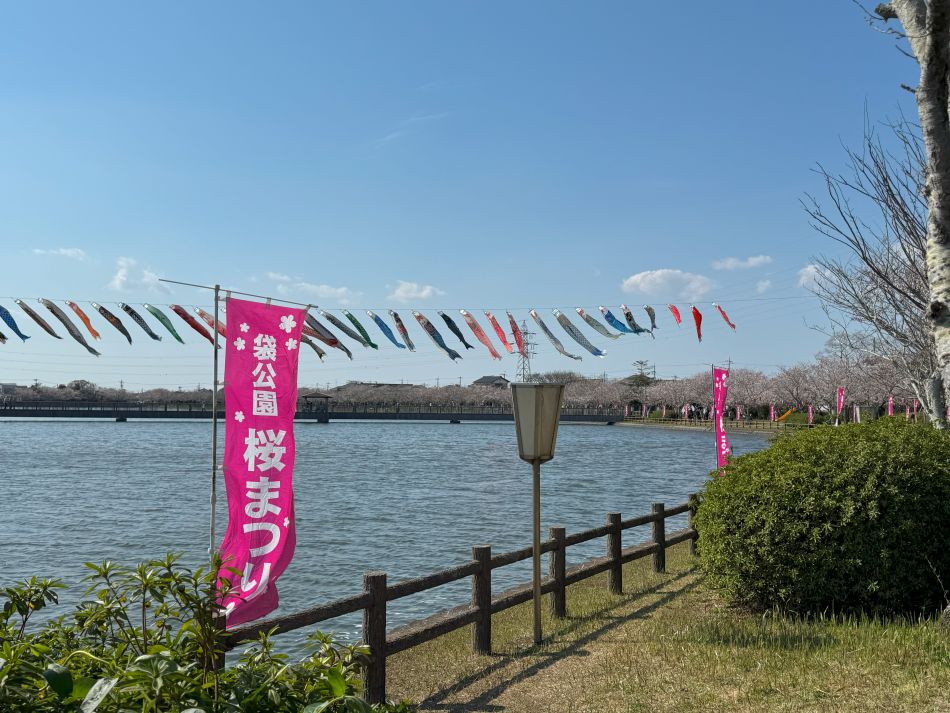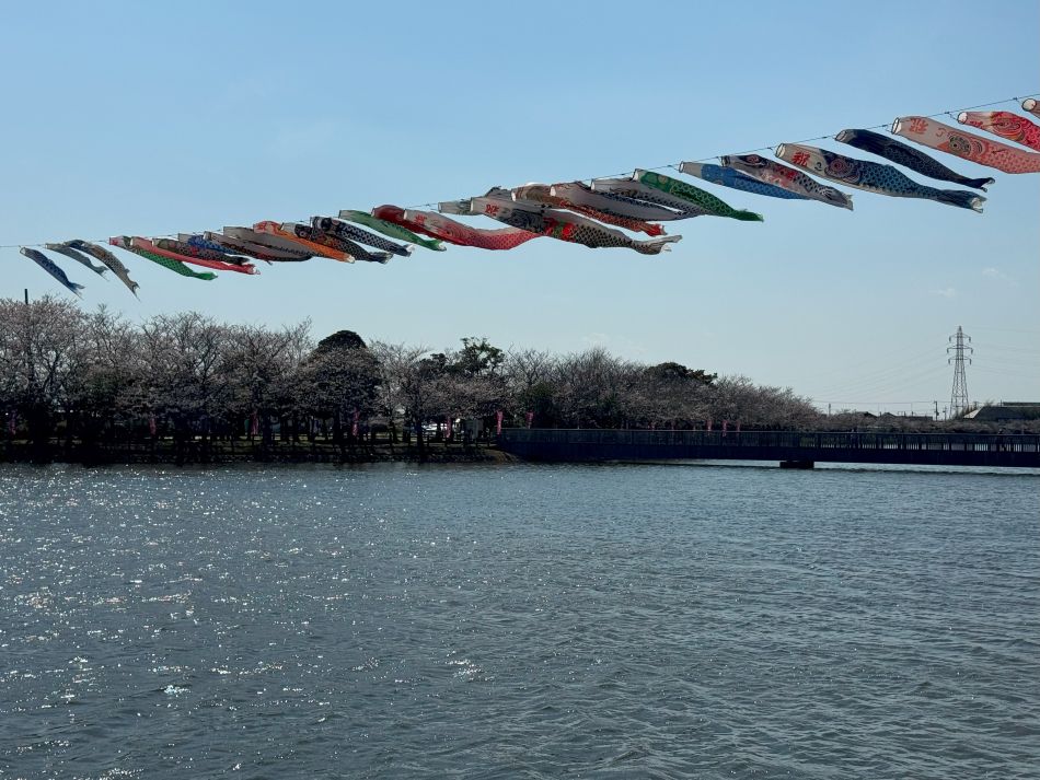 染まった桜と、春風を受けて湖上を元気に泳ぐ約80匹の鯉のぼりが、