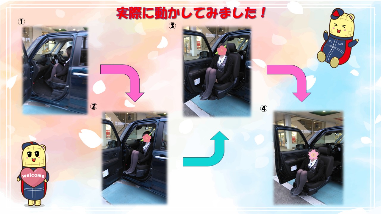 福祉車両で助手席のシートが、電動で外側に回転・下降し、車いすなどへの乗り降りがしやすい仕様になっている車です