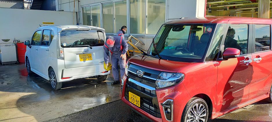 この時、サービススタッフたちは代車をこんな感じで洗っております。
