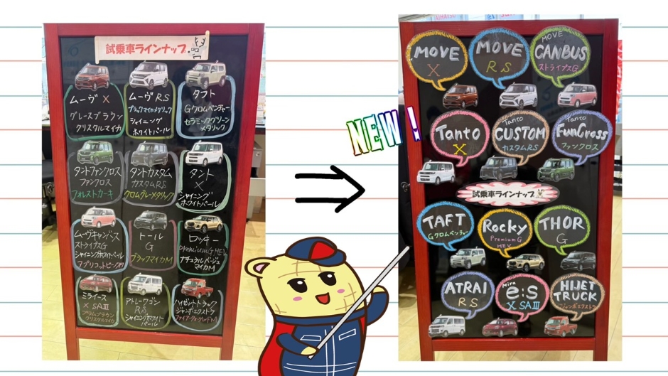 今回は試乗車ラインナップの看板をリニューアルしたのでご紹介していきたいと思います♪